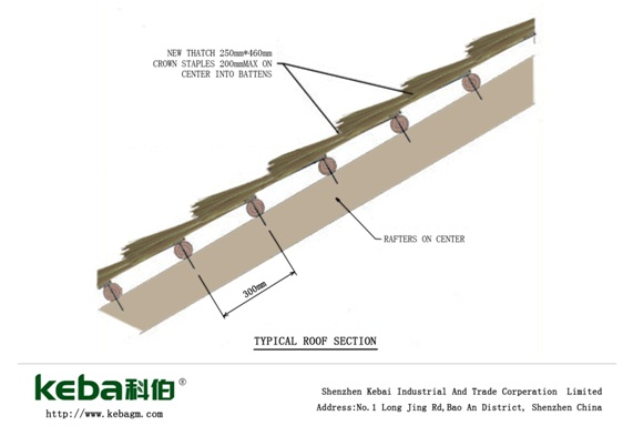 4) ? ?整個屋頂安裝完之后,可將茅草瓦的彎度適當壓一壓,挑一挑,使之順坦自然。(尤其是屋檐部分)