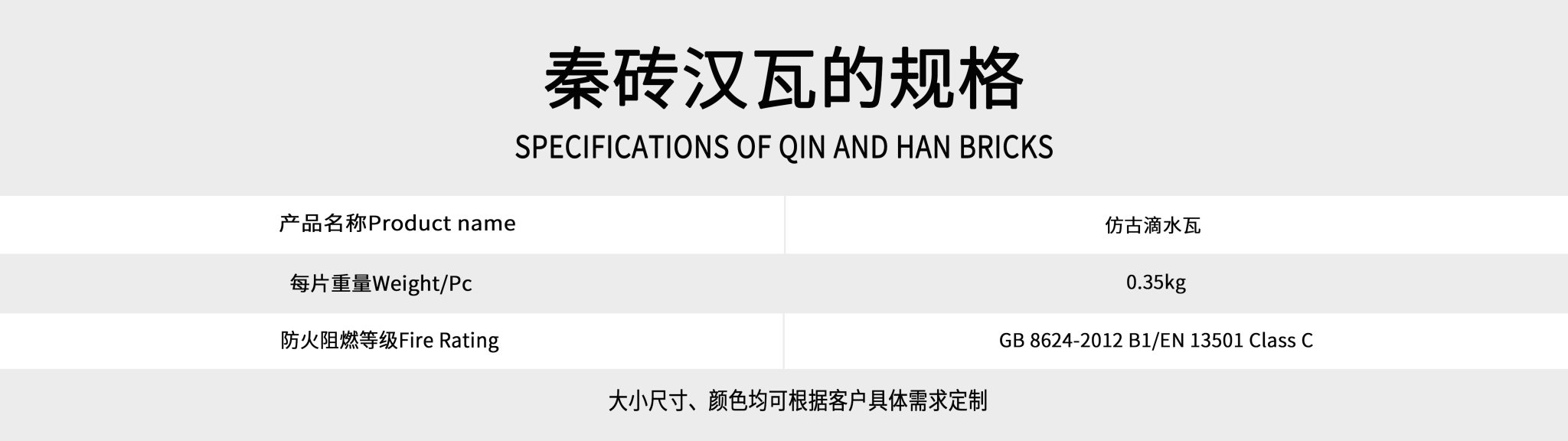 仿古滴水瓦導(dǎo)熱系數(shù)為0.325W/mk,是粘土瓦的1/3,厚水泥瓦的1/5,0.5mm厚彩鋼瓦的1/2000。在不考慮加保溫層的情況下,合成仿古滴水瓦的隔熱保溫性能達(dá)到更佳。