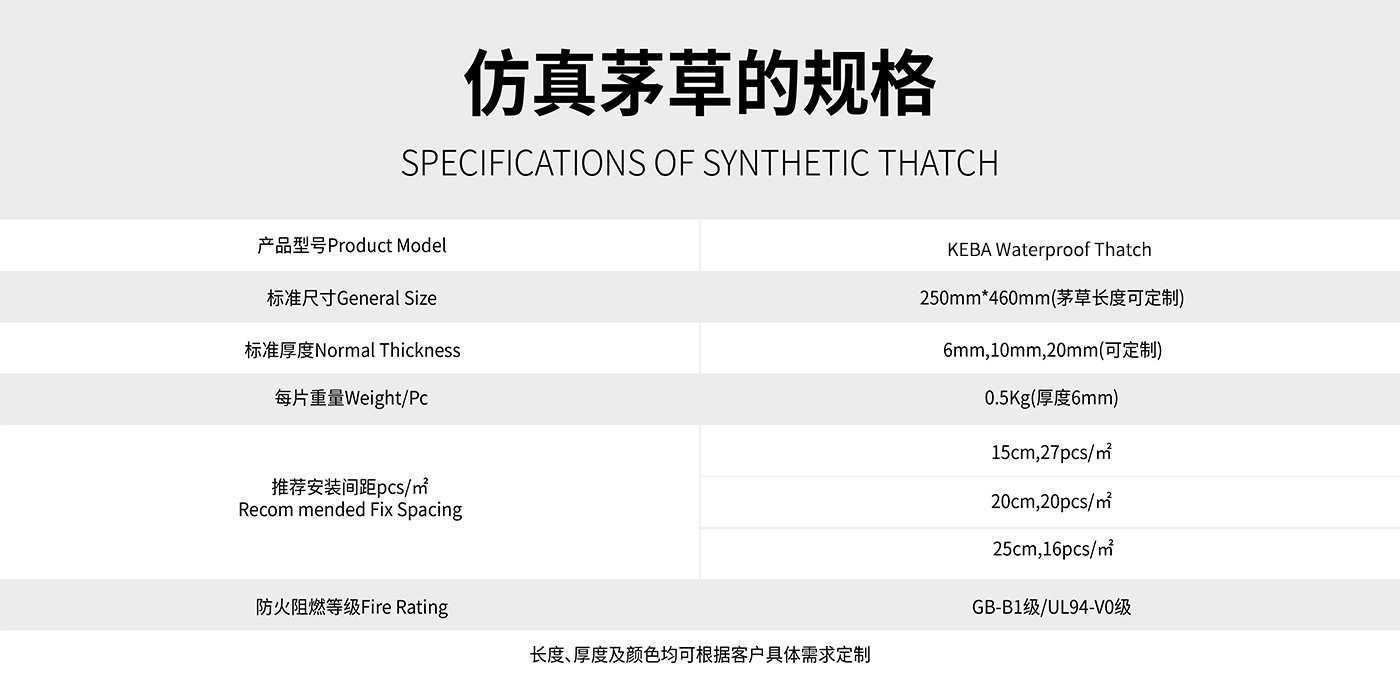 ? ? ? ? 防水仿真茅草是深圳市科佰工貿有限公司采用目前國際上先進的納米合成高分子材料技術和工藝生產。利用納米粒子的特有的物理化學性質,使得其具有更加優異的耐候性及阻燃性,能滿足美國ASTM-G154-06 抗UV老化測試標準,并能通過美標UL94-V0級阻燃,在國內仿真茅草也通過了國家防火建材阻燃測試B1級。?
