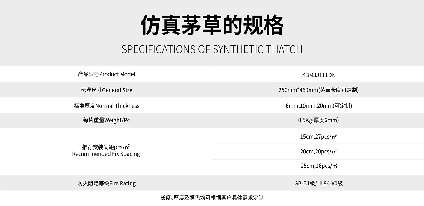 ? ? ? ? 仿真茅草深圳市科佰工貿有限公司采用目前國際上先進的納米合成高分子材料技術和工藝生產。利用納米粒子的特有的物理化學性質,使得其具有更加優異的耐候性及阻燃性,能滿足美國ASTM-G154-06 抗UV老化測試標準,并能通過美標UL94-V0級阻燃,在國內仿真茅草也通過了國家防火建材阻燃測試B1級。?